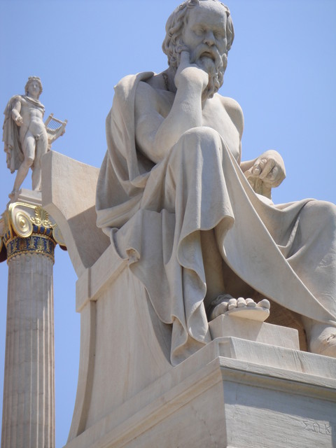 雅典學院前的蘇格拉底與雅典娜(希臘女神/戰神) 柏拉圖與阿波羅(太陽神)