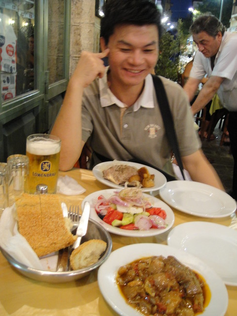 點兩道菜 一盤希臘沙拉 一杯啤酒