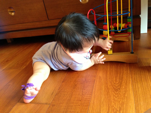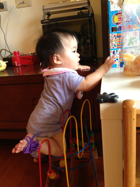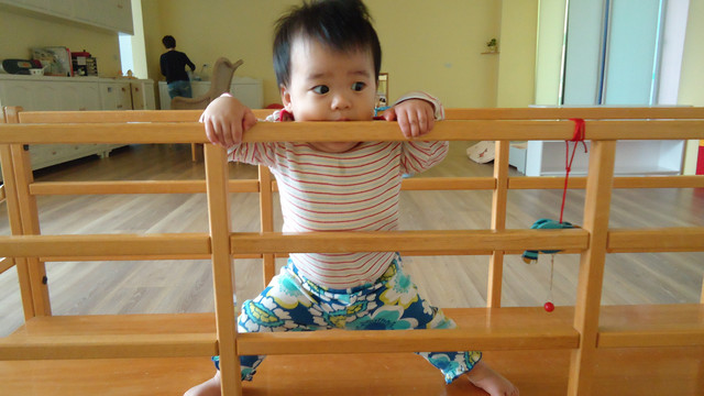 站立時也可以自己安全坐下(才一星期就全學會了!小孩真是學的好快啊!!)